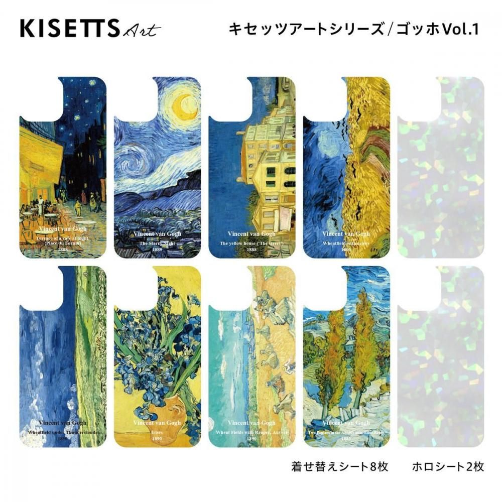 ゴッホの有名絵画がKISETTSの着せ替えシートで登場!夜空と黄色い灯りのコントラストが美しい「夜のカフェテラス」や、大胆な筆使いと色彩が神秘的な「星月夜」を含む着せ替えシート8枚、重ねてアレンジが楽しいホロシート2枚が入った10枚セットです(※iPhoneケースは付属しません)
